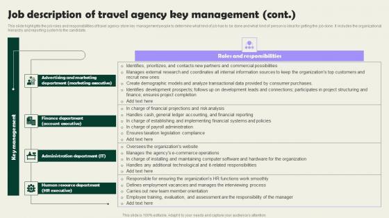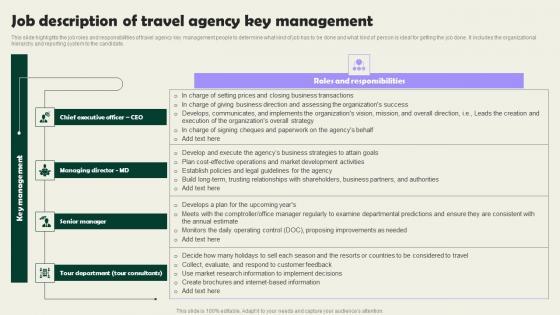 This slide highlights the job roles and responsibilities of travel agency key management people to determine what kind of job has to be done and what kind of person is ideal for getting the job done. It includes the organizational hierarchy and reporting system to the candidate. The best PPT templates are a great way to save time, energy, and resources. Slidegeeks have 100 percent editable powerpoint slides making them incredibly versatile. With these quality presentation templates, you can create a captivating and memorable presentation by combining visually appealing slides and effectively communicating your message. Download Job Description Of Travel Agency Key Management Vacation Planning Business Brochure Pdf from Slidegeeks and deliver a wonderful presentation. This slide highlights the job roles and responsibilities of travel agency key management people to determine what kind of job has to be done and what kind of person is ideal for getting the job done. It includes the organizational hierarchy and reporting system to the candidate.
