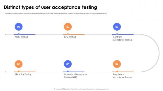 This slide discusses the distinct types of user acceptance testing which includes alpha and beta testing, contract acceptance testing and regulatory acceptance testing. If your project calls for a presentation, then Slidegeeks is your go-to partner because we have professionally designed, easy-to-edit templates that are perfect for any presentation. After downloading, you can easily edit Key Steps And Strategies Distinct Types Of User Acceptance Testing and make the changes accordingly. You can rearrange slides or fill them with different images. Check out all the handy templates This slide discusses the distinct types of user acceptance testing which includes alpha and beta testing, contract acceptance testing and regulatory acceptance testing.
