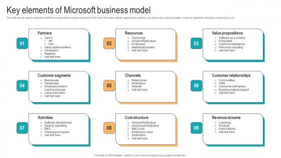 This slide can be used to understand different components involved in business of Microsoft. It includes details regarding key partners, key resources, value proposition, customer segments, channels, cost structure, etc. Make sure to capture your audiences attention in your business displays with our gratis customizable Key Elements Of Microsoft Business Model Strategic Advancements By Microsofts Microsoft Pdf. These are great for business strategies, office conferences, capital raising or task suggestions. If you desire to acquire more customers for your tech business and ensure they stay satisfied, create your own sales presentation with these plain slides. This slide can be used to understand different components involved in business of Microsoft. It includes details regarding key partners, key resources, value proposition, customer segments, channels, cost structure, etc.