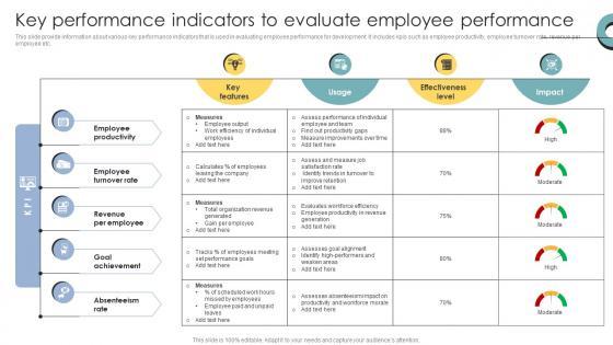 This slide provide information about various key performance indicators that is used in evaluating employee performance for development. It includes kpis such as employee productivity, employee turnover rate, revenue per employee etc. Get a simple yet stunning designed Skill Enhancement Performance Key Performance Indicators To Evaluate Employee Performance. It is the best one to establish the tone in your meetings. It is an excellent way to make your presentations highly effective. So, download this PPT today from Slidegeeks and see the positive impacts. Our easy-to-edit Skill Enhancement Performance Key Performance Indicators To Evaluate Employee Performance can be your go-to option for all upcoming conferences and meetings. So, what are you waiting for Grab this template today. This slide provide information about various key performance indicators that is used in evaluating employee performance for development. It includes kpis such as employee productivity, employee turnover rate, revenue per employee etc.