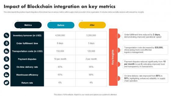 This slide depicts the positive impact integration of blockchain has on various metrics within supply chain ecosystem of an organization. It includes before and after analysis with relevant key insights. Create an editable Impact Of Blockchain Integration On Key Metrics Supply Chain Evolution Harnessing The Power BCT SS V that communicates your idea and engages your audience. Whether you are presenting a business or an educational presentation, pre-designed presentation templates help save time. Impact Of Blockchain Integration On Key Metrics Supply Chain Evolution Harnessing The Power BCT SS V is highly customizable and very easy to edit, covering many different styles from creative to business presentations. Slidegeeks has creative team members who have crafted amazing templates. So, go and get them without any delay. This slide depicts the positive impact integration of blockchain has on various metrics within supply chain ecosystem of an organization. It includes before and after analysis with relevant key insights.