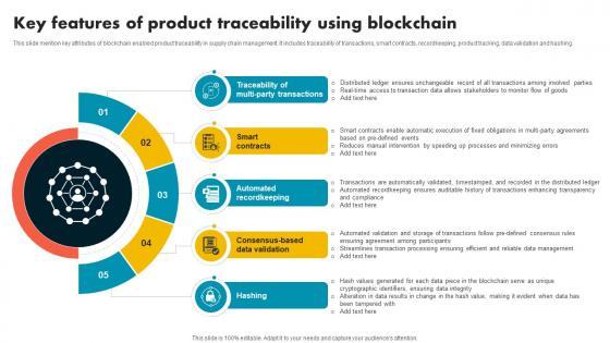 This slide mention key attributes of blockchain enabled product traceability in supply chain management. It includes traceability of transactions, smart contracts, recordkeeping, product tracking, data validation and hashing. If your project calls for a presentation, then Slidegeeks is your go-to partner because we have professionally designed, easy-to-edit templates that are perfect for any presentation. After downloading, you can easily edit Key Features Of Product Traceability Using Blockchain Supply Chain Evolution Harnessing The Power BCT SS V and make the changes accordingly. You can rearrange slides or fill them with different images. Check out all the handy templates This slide mention key attributes of blockchain enabled product traceability in supply chain management. It includes traceability of transactions, smart contracts, recordkeeping, product tracking, data validation and hashing.