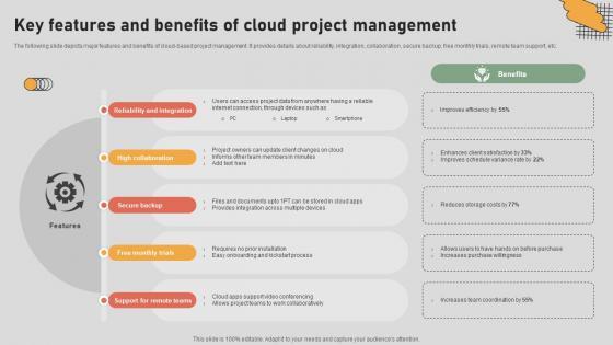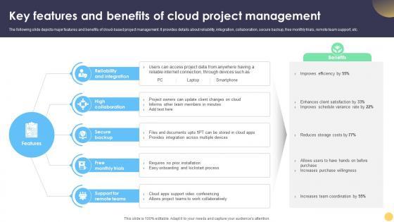 The following slide depicts major features and benefits of cloud-based project management. It provides details about reliability, integration, collaboration, secure backup, free monthly trials, remote team support, etc. This modern and well-arranged Key Features And Benefits Of Cloud Project Management Digital Transformation In Project Management provides lots of creative possibilities. It is very simple to customize and edit with the Powerpoint Software. Just drag and drop your pictures into the shapes. All facets of this template can be edited with Powerpoint, no extra software is necessary. Add your own material, put your images in the places assigned for them, adjust the colors, and then you can show your slides to the world, with an animated slide included. The following slide depicts major features and benefits of cloud-based project management. It provides details about reliability, integration, collaboration, secure backup, free monthly trials, remote team support, etc.
