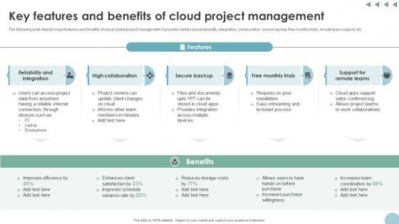 The following slide depicts major features and benefits of cloud based project management. It provides details about reliability, integration, collaboration, secure backup, free monthly trials, remote team support, etc. Get a simple yet stunning designed Key Features And Benefits Of Cloud Project Management Ppt PowerPoint Presentation File Layouts PDF. It is the best one to establish the tone in your meetings. It is an excellent way to make your presentations highly effective. So, download this PPT today from Slidegeeks and see the positive impacts. Our easy to edit Key Features And Benefits Of Cloud Project Management Ppt PowerPoint Presentation File Layouts PDF can be your go to option for all upcoming conferences and meetings. So, what are you waiting for Grab this template today.