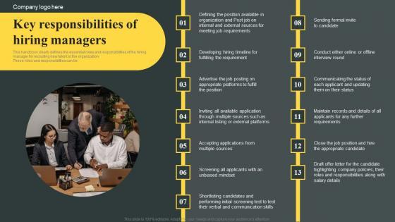 This handbook clearly defines the essential roles and responsibilities of the hiring manager for recruiting new talent in the organization These roles and responsibilities can be. Retrieve professionally designed Key Responsibilities Of Hiring Managers Organizations Guide To Talent Slides Pdf to effectively convey your message and captivate your listeners. Save time by selecting pre-made slideshows that are appropriate for various topics, from business to educational purposes. These themes come in many different styles, from creative to corporate, and all of them are easily adjustable and can be edited quickly. Access them as PowerPoint templates or as Google Slides themes. You do not have to go on a hunt for the perfect presentation because Slidegeeks got you covered from everywhere. This handbook clearly defines the essential roles and responsibilities of the hiring manager for recruiting new talent in the organization These roles and responsibilities can be.