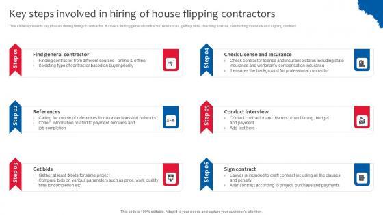 This slide represents key phases during hiring of contractor. It covers finding general contractor, references, getting bids, checking license, conducting interview and signing contract. Welcome to our selection of the Fix And Flip Method For Renovating Real Estate Key Steps Involved In Hiring House Flipping Structure PDF. These are designed to help you showcase your creativity and bring your sphere to life. Planning and Innovation are essential for any business that is just starting out. This collection contains the designs that you need for your everyday presentations. All of our PowerPoints are 100 percent editable, so you can customize them to suit your needs. This multi purpose template can be used in various situations. Grab these presentation templates today.