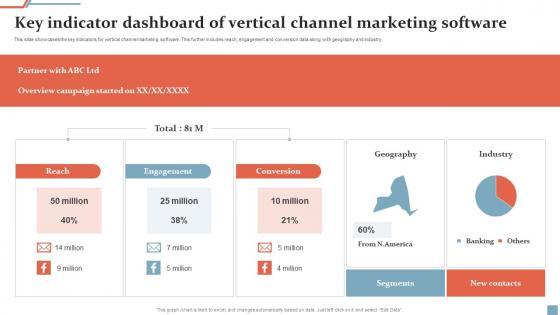 This slide showcases the key indicators for vertical channel marketing software. This further includes reach, engagement and conversion data along with geography and industry. Showcasing this set of slides titled Key Indicator Dashboard Of Vertical Channel Marketing Software Ppt Icon Templates Pdf. The topics addressed in these templates are Reach, Engagement, Conversion. All the content presented in this PPT design is completely editable. Download it and make adjustments in color, background, font etc. as per your unique business setting. This slide showcases the key indicators for vertical channel marketing software. This further includes reach, engagement and conversion data along with geography and industry.