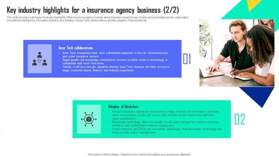 This slide provides a glimpse of industry highlights of the insurance agency market, which includes impact of new models and customized goods, automation and artificial intelligence, innovative analytics and initiative, InsureTech collaborations and the adoption of blockchain etc. Do you have to make sure that everyone on your team knows about any specific topic I yes, then you should give Key Industry Highlights For A Insurance Agency Business Building An Insurance Company Template Pdf a try. Our experts have put a lot of knowledge and effort into creating this impeccable Key Industry Highlights For A Insurance Agency Business Building An Insurance Company Template Pdf You can use this template for your upcoming presentations, as the slides are perfect to represent even the tiniest detail. You can download these templates from the Slidegeeks website and these are easy to edit. So grab these today. This slide provides a glimpse of industry highlights of the insurance agency market, which includes impact of new models and customized goods, automation and artificial intelligence, innovative analytics and initiative, InsureTech collaborations and the adoption of blockchain etc.