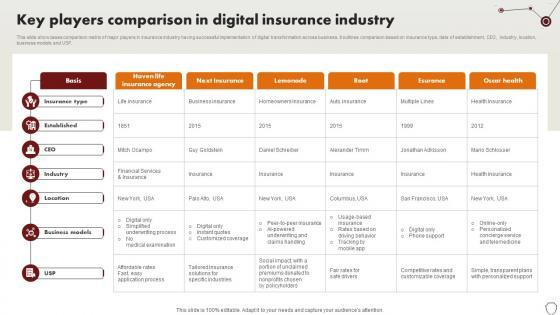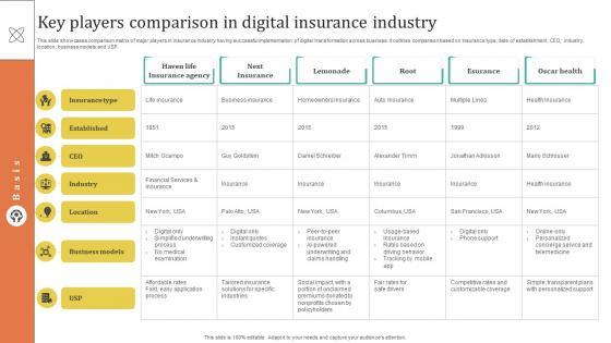 This slide showcases comparison matrix of major players in insurance industry having successful implementation of digital transformation across business. It outlines comparison based on insurance type, date of establishment, CEO, industry, location, business models and USP. Slidegeeks is one of the best resources for PowerPoint templates. You can download easily and regulate Improving Customer Satisfaction Key Players Comparison In Digital Insurance Industry for your personal presentations from our wonderful collection. A few clicks is all it takes to discover and get the most relevant and appropriate templates. Use our Templates to add a unique zing and appeal to your presentation and meetings. All the slides are easy to edit and you can use them even for advertisement purposes. This slide showcases comparison matrix of major players in insurance industry having successful implementation of digital transformation across business. It outlines comparison based on insurance type, date of establishment, CEO, industry, location, business models and USP.
