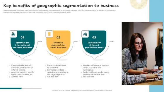 The following slide showcases various advantages of segmenting customers based on geographic elements. It showcases benefits such as effective for international markets business, effective approach for small business and suitable for different population areas. Are you searching for a Key Benefits Of Geographic Segmentation Successful Guide For Market Segmentation Rules Pdf that is uncluttered, straightforward, and original It is easy to edit, and you can change the colors to suit your personal or business branding. For a presentation that expresses how much effort you have put in, this template is ideal With all of its features, including tables, diagrams, statistics, and lists, it is perfect for a business plan presentation. Make your ideas more appealing with these professional slides. Download Key Benefits Of Geographic Segmentation Successful Guide For Market Segmentation Rules Pdf from Slidegeeks today. The following slide showcases various advantages of segmenting customers based on geographic elements. It showcases benefits such as effective for international markets business, effective approach for small business and suitable for different population areas.