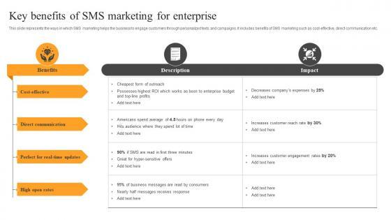 This slide represents the ways in which SMS marketing helps the business to engage customers through personalized texts and campaigns. It includes benefits of SMS marketing such as cost-effective, direct communication etc. Explore a selection of the finest Key Benefits Of SMS Marketing For Enterprise Text Message Marketing Strategies Graphics Pdf here. With a plethora of professionally designed and pre-made slide templates, you can quickly and easily find the right one for your upcoming presentation. You can use our Key Benefits Of SMS Marketing For Enterprise Text Message Marketing Strategies Graphics Pdf to effectively convey your message to a wider audience. Slidegeeks has done a lot of research before preparing these presentation templates. The content can be personalized and the slides are highly editable. Grab templates today from Slidegeeks. This slide represents the ways in which SMS marketing helps the business to engage customers through personalized texts and campaigns. It includes benefits of SMS marketing such as cost-effective, direct communication etc.