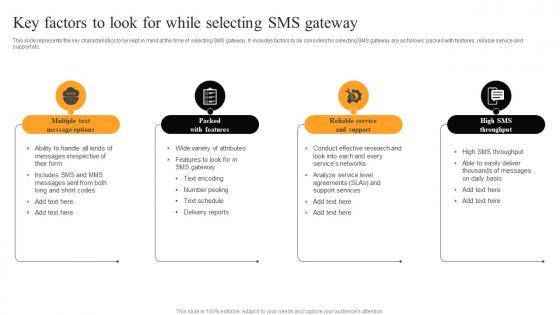 This slide represents the key characteristics to be kept in mind at the time of selecting SMS gateway. It includes factors to be considers for selecting SMS gateway are as follows packed with features, reliable service and support etc. The best PPT templates are a great way to save time, energy, and resources. Slidegeeks have 100 percent editable powerpoint slides making them incredibly versatile. With these quality presentation templates, you can create a captivating and memorable presentation by combining visually appealing slides and effectively communicating your message. Download Key Factors To Look For While Selecting SMS Text Message Marketing Strategies Information Pdf from Slidegeeks and deliver a wonderful presentation. This slide represents the key characteristics to be kept in mind at the time of selecting SMS gateway. It includes factors to be considers for selecting SMS gateway are as follows packed with features, reliable service and support etc.