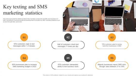This slide represents the statistical data to help marketers analyze the benefits and importance of SMS marketing for business growth and development. It includes key SMS marketing statistics such as click through rates, opt ins etc. Presenting this PowerPoint presentation, titled Key Texting And SMS Marketing Text Message Advertising Solutions Enhancing Themes Pdf, with topics curated by our researchers after extensive research. This editable presentation is available for immediate download and provides attractive features when used. Download now and captivate your audience. Presenting this Key Texting And SMS Marketing Text Message Advertising Solutions Enhancing Themes Pdf. Our researchers have carefully researched and created these slides with all aspects taken into consideration. This is a completely customizable Key Texting And SMS Marketing Text Message Advertising Solutions Enhancing Themes Pdf that is available for immediate downloading. Download now and make an impact on your audience. Highlight the attractive features available with our PPTs. This slide represents the statistical data to help marketers analyze the benefits and importance of SMS marketing for business growth and development. It includes key SMS marketing statistics such as click through rates, opt ins etc.