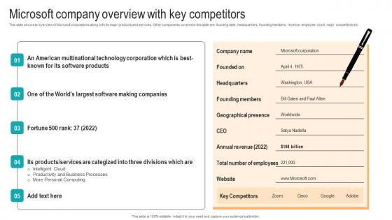 This slide shows an overview of Microsoft corporations along with its major products and services. Other components covered in this slide are founding date, headquarters, founding members, revenue, employee count, major competitors etc. Slidegeeks has constructed Microsoft Company Overview With Key Competitors Strategic Advancements By Microsofts Themes Pdf after conducting extensive research and examination. These presentation templates are constantly being generated and modified based on user preferences and critiques from editors. Here, you will find the most attractive templates for a range of purposes while taking into account ratings and remarks from users regarding the content. This is an excellent jumping-off point to explore our content and will give new users an insight into our top-notch PowerPoint Templates. This slide shows an overview of Microsoft corporations along with its major products and services. Other components covered in this slide are founding date, headquarters, founding members, revenue, employee count, major competitors etc.