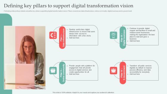 Following slide portrays details about the key pillars supporting digital transformation vision. Pillars covered are data infrastructure, online community, digital business and e-government. Find highly impressive Defining Key Pillars To Support Digital Transformation Vision Ppt Show Templates PDF on Slidegeeks to deliver a meaningful presentation. You can save an ample amount of time using these presentation templates. No need to worry to prepare everything from scratch because Slidegeeks experts have already done a huge research and work for you. You need to download Defining Key Pillars To Support Digital Transformation Vision Ppt Show Templates PDF for your upcoming presentation. All the presentation templates are 100 percent editable and you can change the color and personalize the content accordingly. Download now.