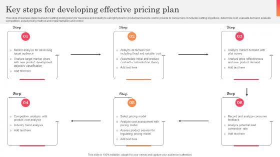 This slide showcase steps involved in setting pricing policy for business and industry to set right price for product and service cost to provide to consumers. It includes setting objectives, determine cost, evaluate demand, evaluate competition, select pricing method and implementation and control. Pitch your topic with ease and precision using this Key Steps For Developing Effective Pricing Plan Ideas Pdf. This layout presents information on Pricing Policy For Business, Product And Service Cost, Evaluate Demand, Evaluate Competition. It is also available for immediate download and adjustment. So, changes can be made in the color, design, graphics or any other component to create a unique layout. This slide showcase steps involved in setting pricing policy for business and industry to set right price for product and service cost to provide to consumers. It includes setting objectives, determine cost, evaluate demand, evaluate competition, select pricing method and implementation and control.