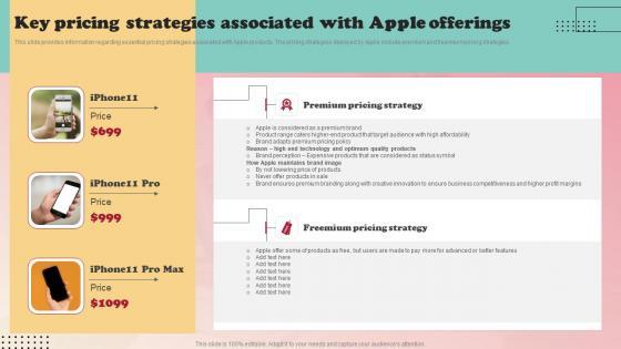 This slide provides information regarding essential pricing strategies associated with Apple products. The pricing strategies deployed by Apple include premium and freemium pricing strategies. Find highly impressive Key Pricing Strategies Associated With Apple Offerings Themes PDF on Slidegeeks to deliver a meaningful presentation. You can save an ample amount of time using these presentation templates. No need to worry to prepare everything from scratch because Slidegeeks experts have already done a huge research and work for you. You need to download Key Pricing Strategies Associated With Apple Offerings Themes PDF for your upcoming presentation. All the presentation templates are 100 percent editable and you can change the color and personalize the content accordingly. Download now.