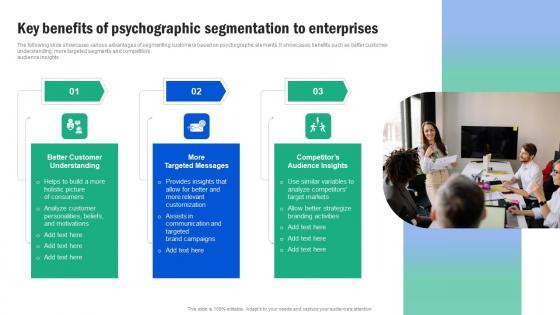 The following slide showcases various advantages of segmenting customers based on psychographic elements. It showcases benefits such as better customer understanding, more targeted segments and competitors audience insights. Coming up with a presentation necessitates that the majority of the effort goes into the content and the message you intend to convey. The visuals of a PowerPoint presentation can only be effective if it supplements and supports the story that is being told. Keeping this in mind our experts created Key Benefits Of Psychographic Segmentation To Enterprises Ppt File Aids PDF to reduce the time that goes into designing the presentation. This way, you can concentrate on the message while our designers take care of providing you with the right template for the situation.