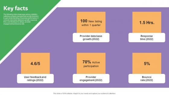 The following slide showcases various statistics outlining company overview that assists investors to gain understanding of business performance. It consists of provider database growth, response time, user feedback and ratings, provider engagement and bounce rate. Find highly impressive Key Facts Carelulu Shareholders Fund Raising Pitch Deck Sample Pdf on Slidegeeks to deliver a meaningful presentation. You can save an ample amount of time using these presentation templates. No need to worry to prepare everything from scratch because Slidegeeks experts have already done a huge research and work for you. You need to download Key Facts Carelulu Shareholders Fund Raising Pitch Deck Sample Pdf for your upcoming presentation. All the presentation templates are 100 percent editable and you can change the color and personalize the content accordingly. Download now The following slide showcases various statistics outlining company overview that assists investors to gain understanding of business performance. It consists of provider database growth, response time, user feedback and ratings, provider engagement and bounce rate.