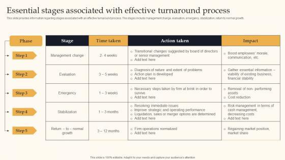 This slide provides information regarding stages associated with an effective turnaround process. The stages include management change, evaluation, emergency, stabilization, return to normal growth. Do you have to make sure that everyone on your team knows about any specific topic I yes, then you should give Essential Stages Associated Effective Key Business Tactics For Organizational Success Themes Pdf a try. Our experts have put a lot of knowledge and effort into creating this impeccable Essential Stages Associated Effective Key Business Tactics For Organizational Success Themes Pdf. You can use this template for your upcoming presentations, as the slides are perfect to represent even the tiniest detail. You can download these templates from the Slidegeeks website and these are easy to edit. So grab these today This slide provides information regarding stages associated with an effective turnaround process. The stages include management change, evaluation, emergency, stabilization, return to normal growth.