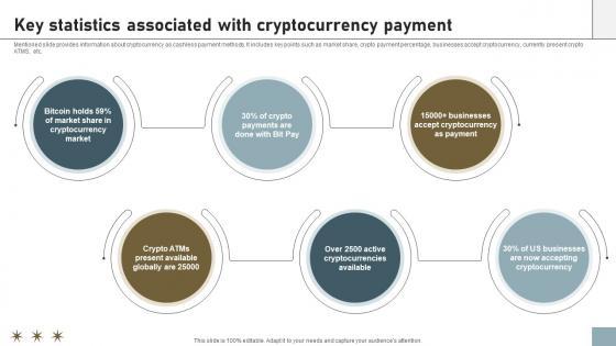 Mentioned slide provides information about cryptocurrency as cashless payment methods. It includes key points such as market share, crypto payment percentage, businesses accept cryptocurrency, currently present crypto ATMS, etc. Do you have to make sure that everyone on your team knows about any specific topic I yes, then you should give A114 Key Statistics Associated With Cryptocurrency Payment a try. Our experts have put a lot of knowledge and effort into creating this impeccable A114 Key Statistics Associated With Cryptocurrency Payment. You can use this template for your upcoming presentations, as the slides are perfect to represent even the tiniest detail. You can download these templates from the Slidegeeks website and these are easy to edit. So grab these today Mentioned slide provides information about cryptocurrency as cashless payment methods. It includes key points such as market share, crypto payment percentage, businesses accept cryptocurrency, currently present crypto ATMS, etc.