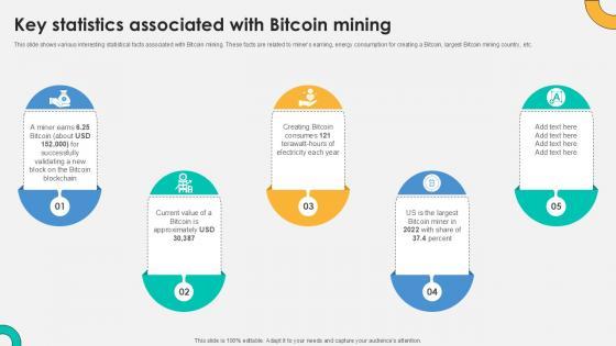 This slide shows various interesting statistical facts associated with Bitcoin mining. These facts are related to miners earning, energy consumption for creating a Bitcoin, largest Bitcoin mining country, etc. Are you in need of a template that can accommodate all of your creative concepts This one is crafted professionally and can be altered to fit any style. Use it with Google Slides or PowerPoint. Include striking photographs, symbols, depictions, and other visuals. Fill, move around, or remove text boxes as desired. Test out color palettes and font mixtures. Edit and save your work, or work with colleagues. Download Key Statistics Associated With Everything About Bitcoin PPT Presentation Fin SS V and observe how to make your presentation outstanding. Give an impeccable presentation to your group and make your presentation unforgettable. This slide shows various interesting statistical facts associated with Bitcoin mining. These facts are related to miners earning, energy consumption for creating a Bitcoin, largest Bitcoin mining country, etc.
