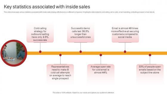 This slide showcases various statistics associated with inside sales strategy effectiveness in different companies. It highlights stats related to cold calling, demo calls, email marketing, contacting prospect, email rate etc. Formulating a presentation can take up a lot of effort and time, so the content and message should always be the primary focus. The visuals of the PowerPoint can enhance the presenters message, so our Remote Sales Plan For Key Statistics Associated With Inside Sales Strategy SS V was created to help save time. Instead of worrying about the design, the presenter can concentrate on the message while our designers work on creating the ideal templates for whatever situation is needed. Slidegeeks has experts for everything from amazing designs to valuable content, we have put everything into Remote Sales Plan For Key Statistics Associated With Inside Sales Strategy SS V. This slide showcases various statistics associated with inside sales strategy effectiveness in different companies. It highlights stats related to cold calling, demo calls, email marketing, contacting prospect, email rate etc.