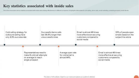 This slide showcases various statistics associated with inside sales strategy effectiveness in different companies. It highlights stats related to cold calling, demo calls, email marketing, contacting prospect, email rate etc. Are you searching for a Virtual Sales Strategies Key Statistics Associated With Inside Sales Strategy SS V that is uncluttered, straightforward, and original Its easy to edit, and you can change the colors to suit your personal or business branding. For a presentation that expresses how much effort you have put in, this template is ideal With all of its features, including tables, diagrams, statistics, and lists, its perfect for a business plan presentation. Make your ideas more appealing with these professional slides. Download Virtual Sales Strategies Key Statistics Associated With Inside Sales Strategy SS V from Slidegeeks today. This slide showcases various statistics associated with inside sales strategy effectiveness in different companies. It highlights stats related to cold calling, demo calls, email marketing, contacting prospect, email rate etc.
