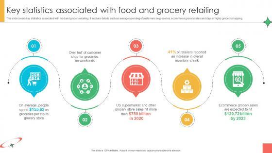 This slide covers key statistics associated with food and grocery retailing. It involves details such as average spending of customers on groceries, ecommerce grocery sales and days of highly grocery shopping. Coming up with a presentation necessitates that the majority of the effort goes into the content and the message you intend to convey. The visuals of a PowerPoint presentation can only be effective if it supplements and supports the story that is being told. Keeping this in mind our experts created Marketing Strategies For Effective Key Statistics Associated With Food And Grocery to reduce the time that goes into designing the presentation. This way, you can concentrate on the message while our designers take care of providing you with the right template for the situation. This slide covers key statistics associated with food and grocery retailing. It involves details such as average spending of customers on groceries, ecommerce grocery sales and days of highly grocery shopping.
