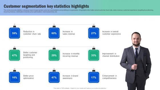 This slide presents statistics showing impact of appropriate customer segmentation and profiling on organization. It highlights information about customer churn rate, sales revenue, customer experience, targeting and positioning, recurring revenue, distribution channel, price optimization, brand awareness, etc. From laying roadmaps to briefing everything in detail, our templates are perfect for you. You can set the stage with your presentation slides. All you have to do is download these easy-to-edit and customizable templates. Customer Segmentation Key Statistics Highlights Successful Guide For Market Segmentation Brochure Pdf will help you deliver an outstanding performance that everyone would remember and praise you for. Do download this presentation today. This slide presents statistics showing impact of appropriate customer segmentation and profiling on organization. It highlights information about customer churn rate, sales revenue, customer experience, targeting and positioning, recurring revenue, distribution channel, price optimization, brand awareness, etc.