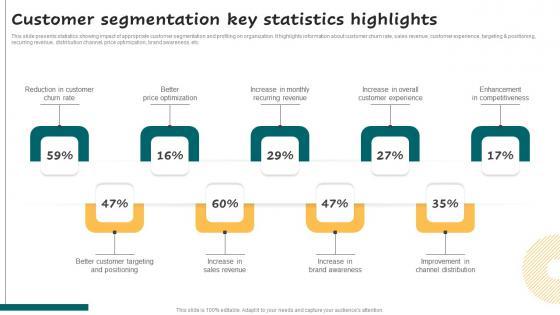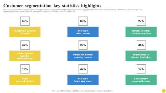 This slide presents statistics showing impact of appropriate customer segmentation and profiling on organization. It highlights information about customer churn rate, sales revenue, customer experience, targeting and positioning, recurring revenue, distribution channel, price optimization, brand awareness, etc. From laying roadmaps to briefing everything in detail, our templates are perfect for you. You can set the stage with your presentation slides. All you have to do is download these easy to edit and customizable templates. Customer Segmentation Key Statistics Highlights Guide For Segmenting And Formulating Demonstration Pdf will help you deliver an outstanding performance that everyone would remember and praise you for. Do download this presentation today. This slide presents statistics showing impact of appropriate customer segmentation and profiling on organization. It highlights information about customer churn rate, sales revenue, customer experience, targeting and positioning, recurring revenue, distribution channel, price optimization, brand awareness, etc.
