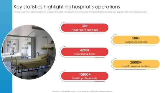 This slide covers the key statistics related to the operations of a hospital. It includes stats such as the number of healthcare facilities, operational beds, diagnostic centers and health professionals. Here you can discover an assortment of the finest PowerPoint and Google Slides templates. With these templates, you can create presentations for a variety of purposes while simultaneously providing your audience with an eye-catching visual experience. Download Key Statistics Highlighting Hospitals Operations Implementation Of Online Ppt Sample to deliver an impeccable presentation. These templates will make your job of preparing presentations much quicker, yet still, maintain a high level of quality. Slidegeeks has experienced researchers who prepare these templates and write high-quality content for you. Later on, you can personalize the content by editing the Key Statistics Highlighting Hospitals Operations Implementation Of Online Ppt Sample. This slide covers the key statistics related to the operations of a hospital. It includes stats such as the number of healthcare facilities, operational beds, diagnostic centers and health professionals.