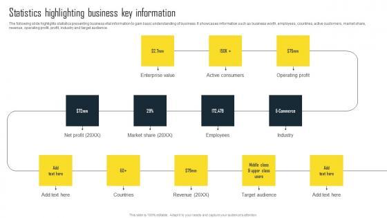 The following slide highlights statistics presenting business vital information to gain basic understanding of business. It showcases information such as business worth, employees, countries, active customers, market share, revenue, operating profit, profit, industry and target audience. Make sure to capture your audiences attention in your business displays with our gratis customizable Statistics Highlighting Business Key Information Comprehensive Guide Mockup Pdf These are great for business strategies, office conferences, capital raising or task suggestions. If you desire to acquire more customers for your tech business and ensure they stay satisfied, create your own sales presentation with these plain slides. The following slide highlights statistics presenting business vital information to gain basic understanding of business. It showcases information such as business worth, employees, countries, active customers, market share, revenue, operating profit, profit, industry and target audience.