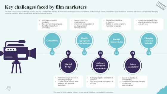 The slide outlies various challenges faced in film and entertainment industry. It showcases challenges such as competition, limited budget, identify appropriate target audiences, audience perception management, changing consumer behavior, actors unavailability and limited release window.. The best PPT templates are a great way to save time, energy, and resources. Slidegeeks have 100 percent editable powerpoint slides making them incredibly versatile. With these quality presentation templates, you can create a captivating and memorable presentation by combining visually appealing slides and effectively communicating your message. Download Key Challenges Faced By Film Marketers Strategic Plan To Increase Film Ppt Sample Strategy SS V from Slidegeeks and deliver a wonderful presentation. The slide outlies various challenges faced in film and entertainment industry. It showcases challenges such as competition, limited budget, identify appropriate target audiences, audience perception management, changing consumer behavior, actors unavailability and limited release window..
