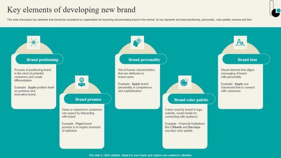 This slide showcases key elements that should be considered by organization for launching and promoting brand in the market. Its key elements are brand positioning, personality, color palette, promise and font. Explore a selection of the finest Key Elements Of Developing New Brand Strategic Marketing Plan Clipart PDF here. With a plethora of professionally designed and pre-made slide templates, you can quickly and easily find the right one for your upcoming presentation. You can use our Key Elements Of Developing New Brand Strategic Marketing Plan Clipart PDF to effectively convey your message to a wider audience. Slidegeeks has done a lot of research before preparing these presentation templates. The content can be personalized and the slides are highly editable. Grab templates today from Slidegeeks. This slide showcases key elements that should be considered by organization for launching and promoting brand in the market. Its key elements are brand positioning, personality, color palette, promise and font.