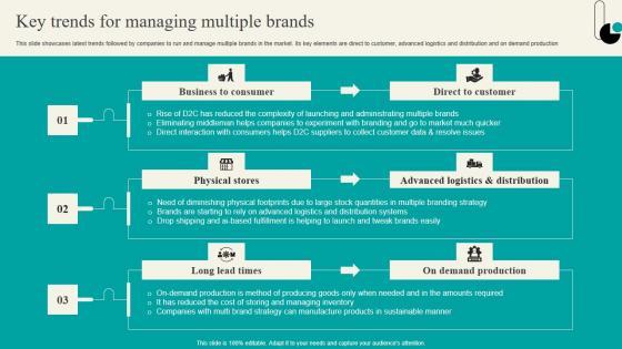 This slide showcases latest trends followed by companies to run and manage multiple brands in the market. Its key elements are direct to customer, advanced logistics and distribution and on demand production. The best PPT templates are a great way to save time, energy, and resources. Slidegeeks have 100 percent editable powerpoint slides making them incredibly versatile. With these quality presentation templates, you can create a captivating and memorable presentation by combining visually appealing slides and effectively communicating your message. Download Key Trends For Managing Multiple Brands Strategic Marketing Plan Elements PDF from Slidegeeks and deliver a wonderful presentation. This slide showcases latest trends followed by companies to run and manage multiple brands in the market. Its key elements are direct to customer, advanced logistics and distribution and on demand production.