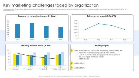 This slide provides glimpse about multiple marketing challenges faced by the travel business regarding current and past marketing performance. It includes revenue by repeat customers, return on ad spend, monthly website traffic, etc. Explore a selection of the finest Strategic Marketing Plan Key Marketing Challenges Faced By Organization Clipart Pdf here. With a plethora of professionally designed and pre-made slide templates, you can quickly and easily find the right one for your upcoming presentation. You can use our Strategic Marketing Plan Key Marketing Challenges Faced By Organization Clipart Pdf to effectively convey your message to a wider audience. Slidegeeks has done a lot of research before preparing these presentation templates. The content can be personalized and the slides are highly editable. Grab templates today from Slidegeeks. This slide provides glimpse about multiple marketing challenges faced by the travel business regarding current and past marketing performance. It includes revenue by repeat customers, return on ad spend, monthly website traffic, etc.