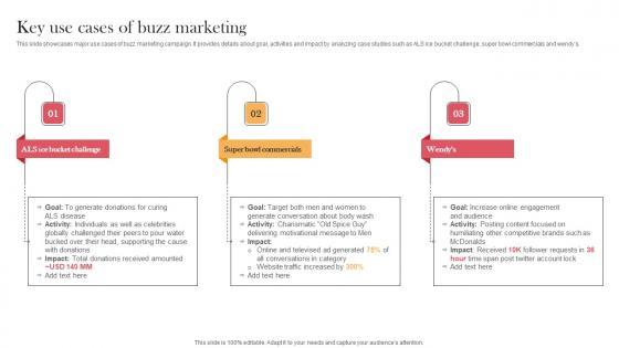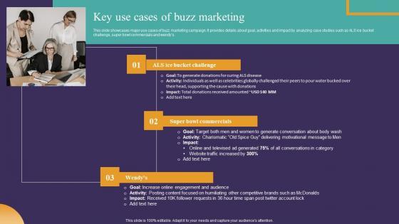 This slide showcases major use cases of buzz marketing campaign. It provides details about goal, activities and impact by analyzing case studies such as ALS ice bucket challenge, super bowl commercials and wendys. Slidegeeks has constructed Viral Marketing Techniques To Increase Annual Business Sales Key Use Cases Of Buzz Marketing Themes PDF after conducting extensive research and examination. These presentation templates are constantly being generated and modified based on user preferences and critiques from editors. Here, you will find the most attractive templates for a range of purposes while taking into account ratings and remarks from users regarding the content. This is an excellent jumping-off point to explore our content and will give new users an insight into our top-notch PowerPoint Templates.
