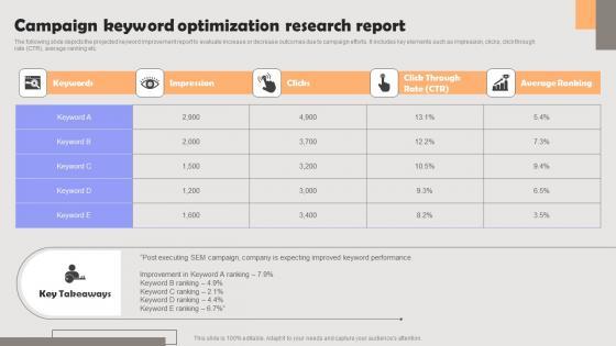 The following slide depicts the projected keyword improvement report to evaluate increase or decrease outcomes due to campaign efforts. It includes key elements such as impression, clicks, click through rate CTR, average ranking etc. The Search Engine Marketing Campaign Keyword Optimization Research Report Pictures PDF is a compilation of the most recent design trends as a series of slides. It is suitable for any subject or industry presentation, containing attractive visuals and photo spots for businesses to clearly express their messages. This template contains a variety of slides for the user to input data, such as structures to contrast two elements, bullet points, and slides for written information. Slidegeeks is prepared to create an impression.