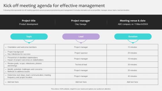 Following slide represents kick off meeting agenda to assure proper project planning and management. It includes elements such as project title, manager, venue, topics, lead and duration. Are you searching for a Project Stakeholders Management Kick Off Meeting Agenda For Effective Ppt Powerpoint that is uncluttered, straightforward, and original Its easy to edit, and you can change the colors to suit your personal or business branding. For a presentation that expresses how much effort you have put in, this template is ideal With all of its features, including tables, diagrams, statistics, and lists, its perfect for a business plan presentation. Make your ideas more appealing with these professional slides. Download Project Stakeholders Management Kick Off Meeting Agenda For Effective Ppt Powerpoint from Slidegeeks today. Following slide represents kick off meeting agenda to assure proper project planning and management. It includes elements such as project title, manager, venue, topics, lead and duration.