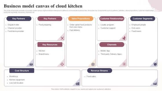 This slide showcases presents a business model canvas of ghost kitchen enterprise to define communicate business idea. It includes key components such as partners, activities, value propositions, customer relationships, customer segments, resources, channels, etc.Slidegeeks is one of the best resources for PowerPoint templates. You can download easily and regulate Business Model Canvas Of Cloud Kitchen Analyzing Global Commissary Kitchen Industry Structure PDF for your personal presentations from our wonderful collection. A few clicks is all it takes to discover and get the most relevant and appropriate templates. Use our Templates to add a unique zing and appeal to your presentation and meetings. All the slides are easy to edit and you can use them even for advertisement purposes.