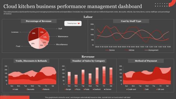This slide presents a dashboard for tracking and managing business income and expenditure. It includes key components such as method of payment, voids, discounts, refunds, top menu items, cost by staff type and percentage of revenue. Do you have an important presentation coming up Are you looking for something that will make your presentation stand out from the rest Look no further than International Food Delivery Market Cloud Kitchen Business Performance Management Slides Pdf. With our professional designs, you can trust that your presentation will pop and make delivering it a smooth process. And with Slidegeeks, you can trust that your presentation will be unique and memorable. So why wait Grab International Food Delivery Market Cloud Kitchen Business Performance Management Slides Pdf today and make your presentation stand out from the rest. This slide presents a dashboard for tracking and managing business income and expenditure. It includes key components such as method of payment, voids, discounts, refunds, top menu items, cost by staff type and percentage of revenue.