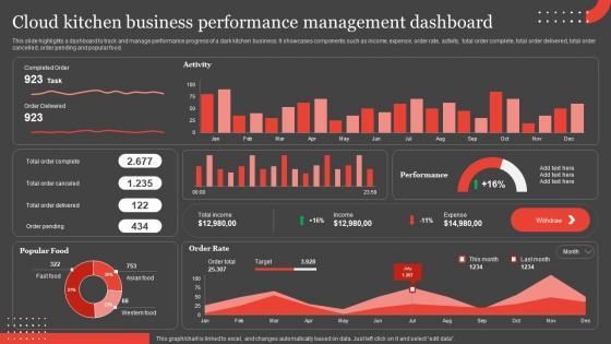 This slide highlights a dashboard to track and manage performance progress of a dark kitchen business. It showcases components such as income, expense, order rate, activity, total order complete, total order delivered, total order cancelled, order pending and popular food. From laying roadmaps to briefing everything in detail, our templates are perfect for you. You can set the stage with your presentation slides. All you have to do is download these easy-to-edit and customizable templates. International Cloud Kitchen Industry Analysis Cloud Kitchen Business Performance Management Guidelines PDF will help you deliver an outstanding performance that everyone would remember and praise you for. Do download this presentation today.