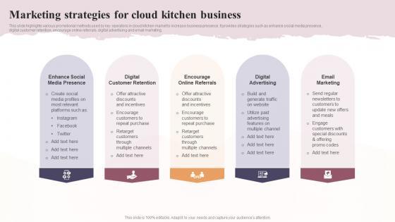 This slide highlights various promotional methods used by key operators in cloud kitchen market to increase business presence. It provides strategies such as enhance social media presence, digital customer retention, encourage online referrals, digital advertising and email marketing.Boost your pitch with our creative Marketing Strategies For Cloud Kitchen Business Analyzing Global Commissary Kitchen Industry Formats PDF. Deliver an awe-inspiring pitch that will mesmerize everyone. Using these presentation templates you will surely catch everyones attention. You can browse the ppts collection on our website. We have researchers who are experts at creating the right content for the templates. So you do not have to invest time in any additional work. Just grab the template now and use them.