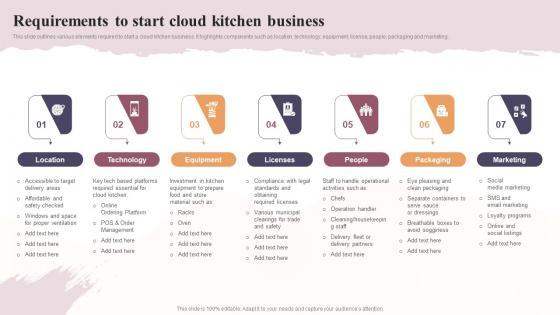 This slide outlines various elements required to start a cloud kitchen business. It highlights components such as location, technology, equipment, license, people, packaging and marketing. Whether you have daily or monthly meetings, a brilliant presentation is necessary. Requirements To Start Cloud Kitchen Business Global Virtual Restaurant Template Pdf can be your best option for delivering a presentation. Represent everything in detail using Requirements To Start Cloud Kitchen Business Global Virtual Restaurant Template Pdf and make yourself stand out in meetings. The template is versatile and follows a structure that will cater to your requirements. All the templates prepared by Slidegeeks are easy to download and edit. Our research experts have taken care of the corporate themes as well. So, give it a try and see the results. This slide outlines various elements required to start a cloud kitchen business. It highlights components such as location, technology, equipment, license, people, packaging and marketing.