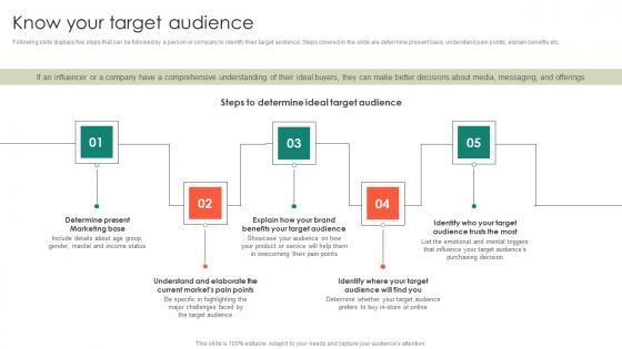 Following slide displays five steps that can be followed by a person or company to identify their target audience. Steps covered in the slide are determine present base, understand pain points, explain benefits etc.Want to ace your presentation in front of a live audience Our Developing Personal Brand On Social Media Channels Know Your Target Audience Inspiration PDF can help you do that by engaging all the users towards you. Slidegeeks experts have put their efforts and expertise into creating these impeccable powerpoint presentations so that you can communicate your ideas clearly. Moreover, all the templates are customizable, and easy-to-edit and downloadable. Use these for both personal and commercial use.