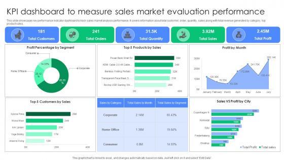 This slide showcases key performance indicator dashboard to track sales market analysis performance. It covers information about total customer, order, quantity, sales along with total revenue generated by category, top product sales. Pitch your topic with ease and precision using this KPI Dashboard To Measure Sales Market Evaluation Performance Summary Pdf. This layout presents information on Profit Percentage Segment, Products Sales, Profit Month. It is also available for immediate download and adjustment. So, changes can be made in the color, design, graphics or any other component to create a unique layout. This slide showcases key performance indicator dashboard to track sales market analysis performance. It covers information about total customer, order, quantity, sales along with total revenue generated by category, top product sales.