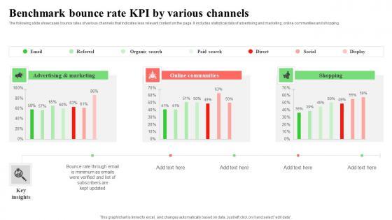 The following slide showcases bounce rates of various channels that indicates less relevant content on the page. It includes statistical data of advertising and marketing, online communities and shopping. Pitch your topic with ease and precision using this Benchmark Bounce Rate KPI By Various Channels Infographics Pdf. This layout presents information on Advertising,Marketing, Online Communities. It is also available for immediate download and adjustment. So, changes can be made in the color, design, graphics or any other component to create a unique layout. The following slide showcases bounce rates of various channels that indicates less relevant content on the page. It includes statistical data of advertising and marketing, online communities and shopping.