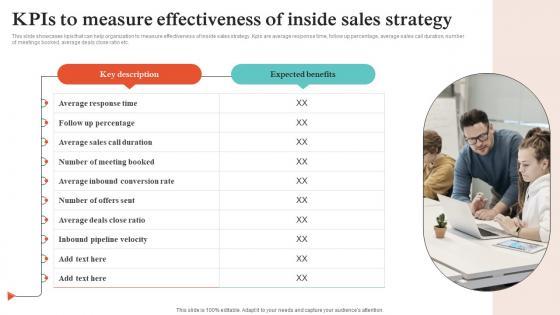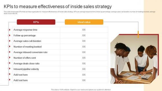 This slide showcases KPIs that can help organization to measure effectiveness of inside sales strategy. KPIs are average response time, follow up percentage, average sales call duration, number of meetings booked, average deals close ratio etc. This Remote Sales Plan For Kpis To Measure Effectiveness Of Inside Sales Strategy SS V is perfect for any presentation, be it in front of clients or colleagues. It is a versatile and stylish solution for organizing your meetings. The Remote Sales Plan For Kpis To Measure Effectiveness Of Inside Sales Strategy SS V features a modern design for your presentation meetings. The adjustable and customizable slides provide unlimited possibilities for acing up your presentation. Slidegeeks has done all the homework before launching the product for you. So, do not wait, grab the presentation templates today This slide showcases KPIs that can help organization to measure effectiveness of inside sales strategy. KPIs are average response time, follow up percentage, average sales call duration, number of meetings booked, average deals close ratio etc.