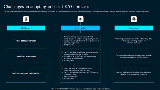 This slide showcases challenges faced by banking institutions in adoption of AI models for effective customer KYC process. Key challenges faced by organization are poor data preparation, untrained employees and lack of customer satisfaction.Create an editable Challenges In Adopting Ai Based KYC Process Artificial Intelligence Applications Themes Pdf that communicates your idea and engages your audience. Whether you are presenting a business or an educational presentation, pre-designed presentation templates help save time. Challenges In Adopting Ai Based KYC Process Artificial Intelligence Applications Themes Pdf is highly customizable and very easy to edit, covering many different styles from creative to business presentations. Slidegeeks has creative team members who have crafted amazing templates. So, go and get them without any delay. This slide showcases challenges faced by banking institutions in adoption of AI models for effective customer KYC process. Key challenges faced by organization are poor data preparation, untrained employees and lack of customer satisfaction.